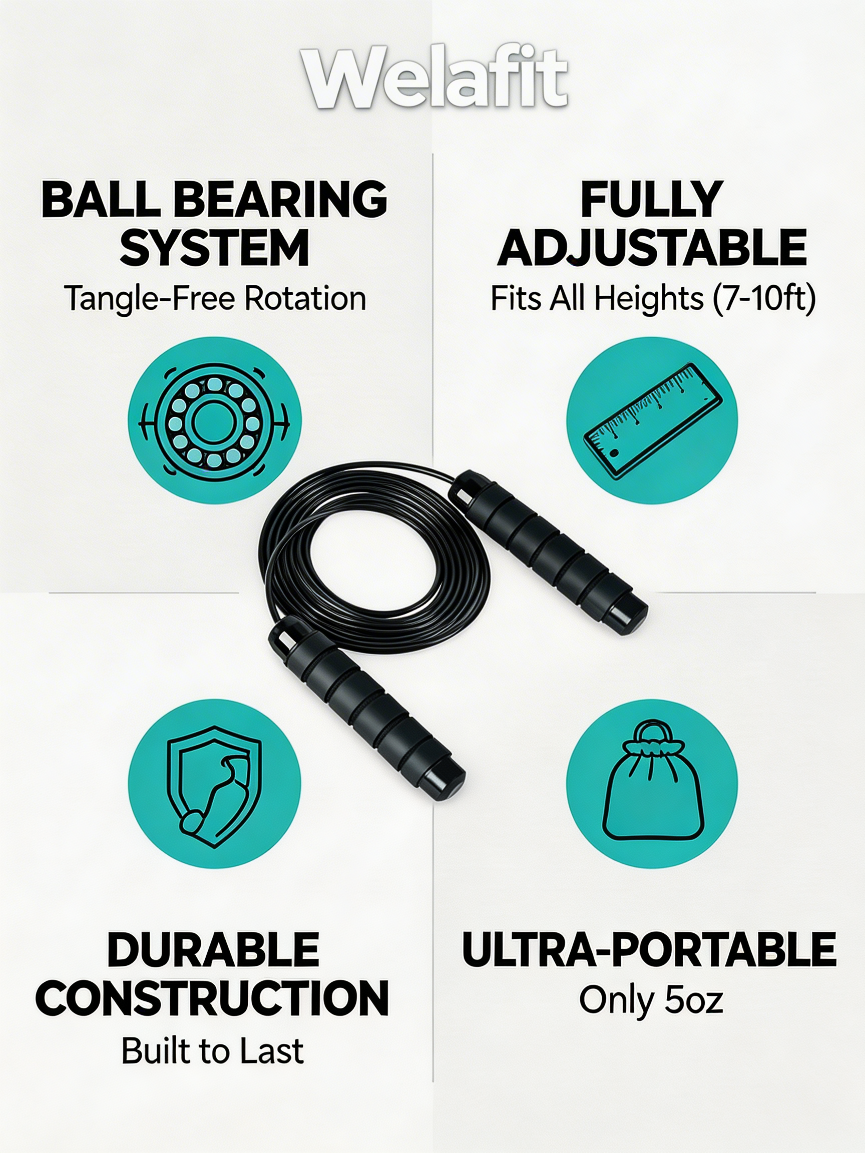 Premium steel cable wrapped in PVC coating withstands thousands of workouts without fraying or breaking. Ergonomic foam handles provide comfortable grip even during sweaty sessions. At just 5oz, the rope is light enough for speed work yet substantial enough to maintain momentum. Compact and portable—toss it in your gym bag and train anywhere, anytime.
